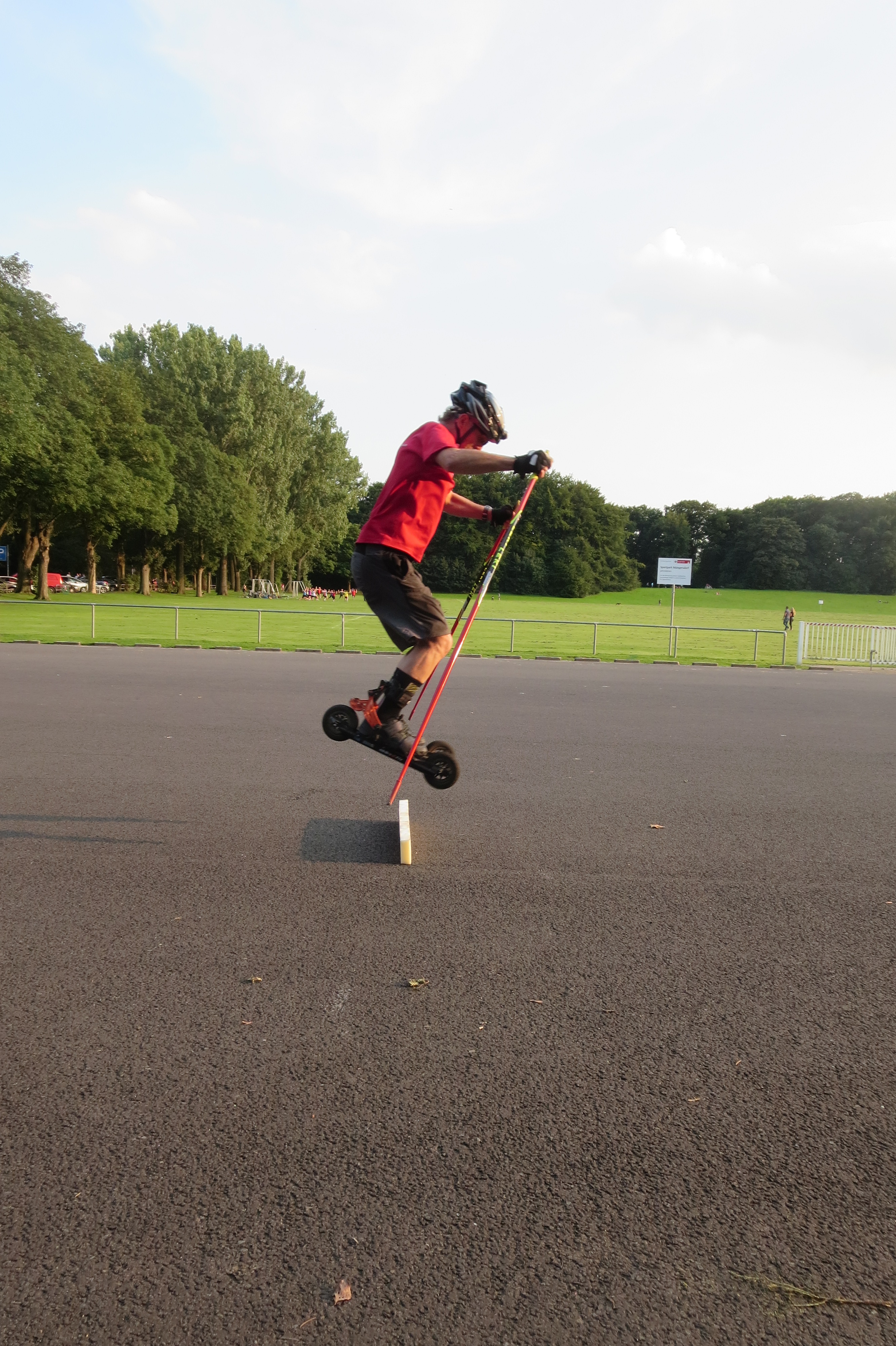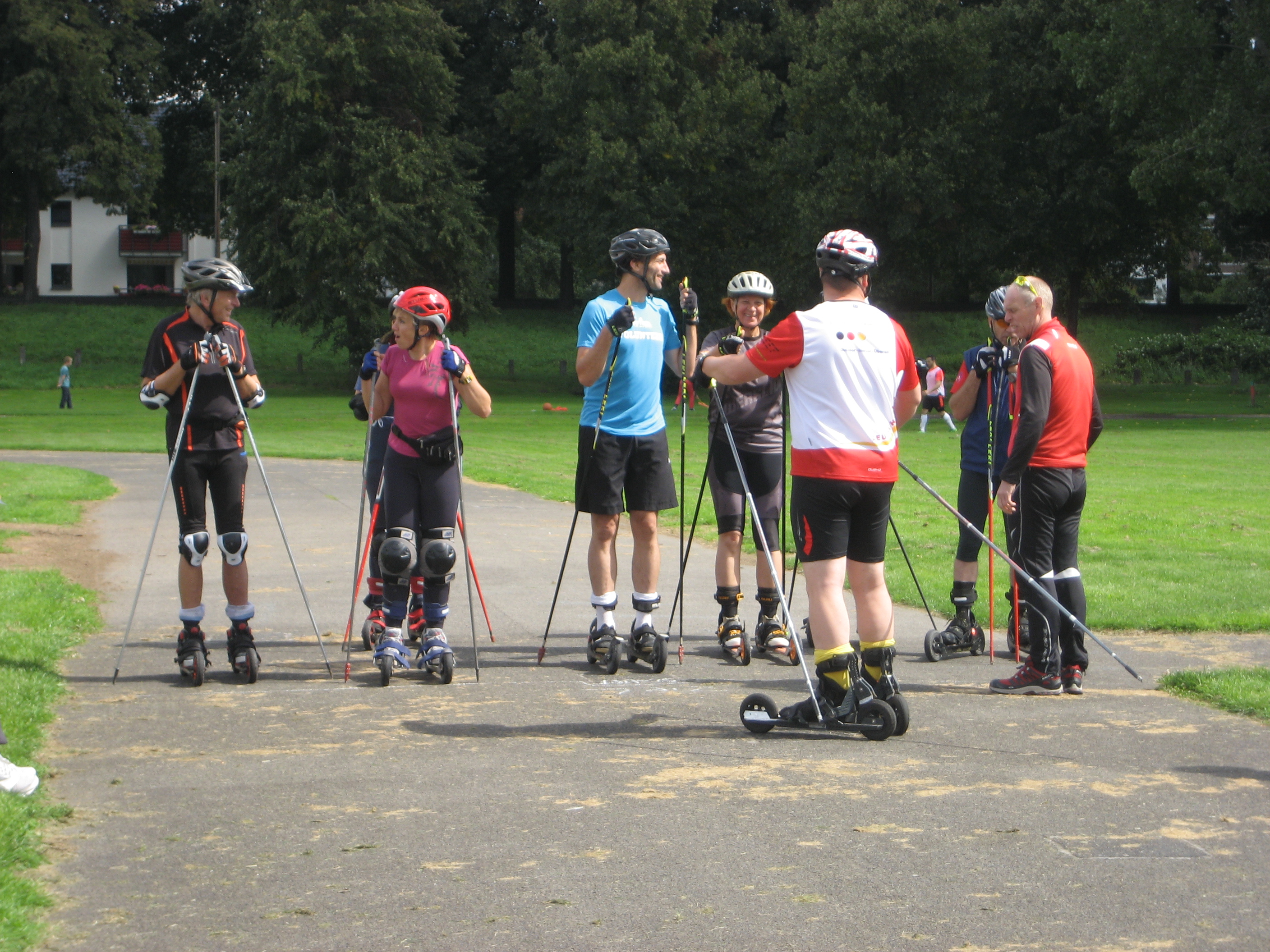 Sie haben zwei luftgefüllte Gummireifen mit einem Durchmesser von 150 mm. Die Räder sind verstellbar, so dass die Aluminiumschiene dazwischen für Schuhgrößen von 36 - 47 passen. Befestigt wird der Schuh mit den 3 Klettverschlüssen (oder Ratschen). Die Bremse ist individuell einstellbar und funktioniert extrem gut, hat wenig Verschleiß und ist während der Abfahrt gut zu dosieren. Die Skikes werden zusammen mit Variostöcken in Schulterhöhe gefahren. Die Höhe der Stöcke ist bei unseren Trainingsmaterialien ebenfalls einstellbar. Unsere Schnupperkurse oder feste Trainingseinheiten findest Du auf: www.skiclub-koeln.de
